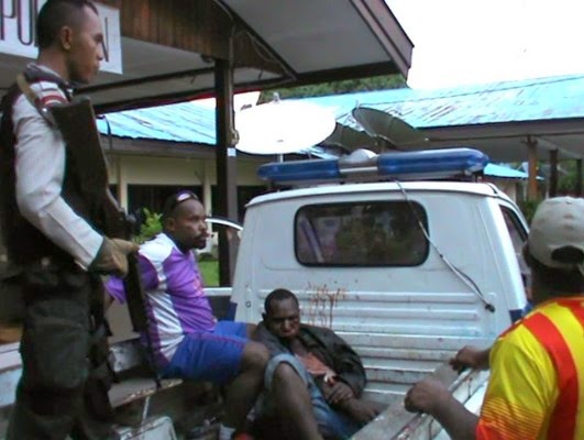 | Seorang warga kena tikam di evakuasi ke rumah sakit menggunakan mobil polisi (Foto : Reyner Windesi) |